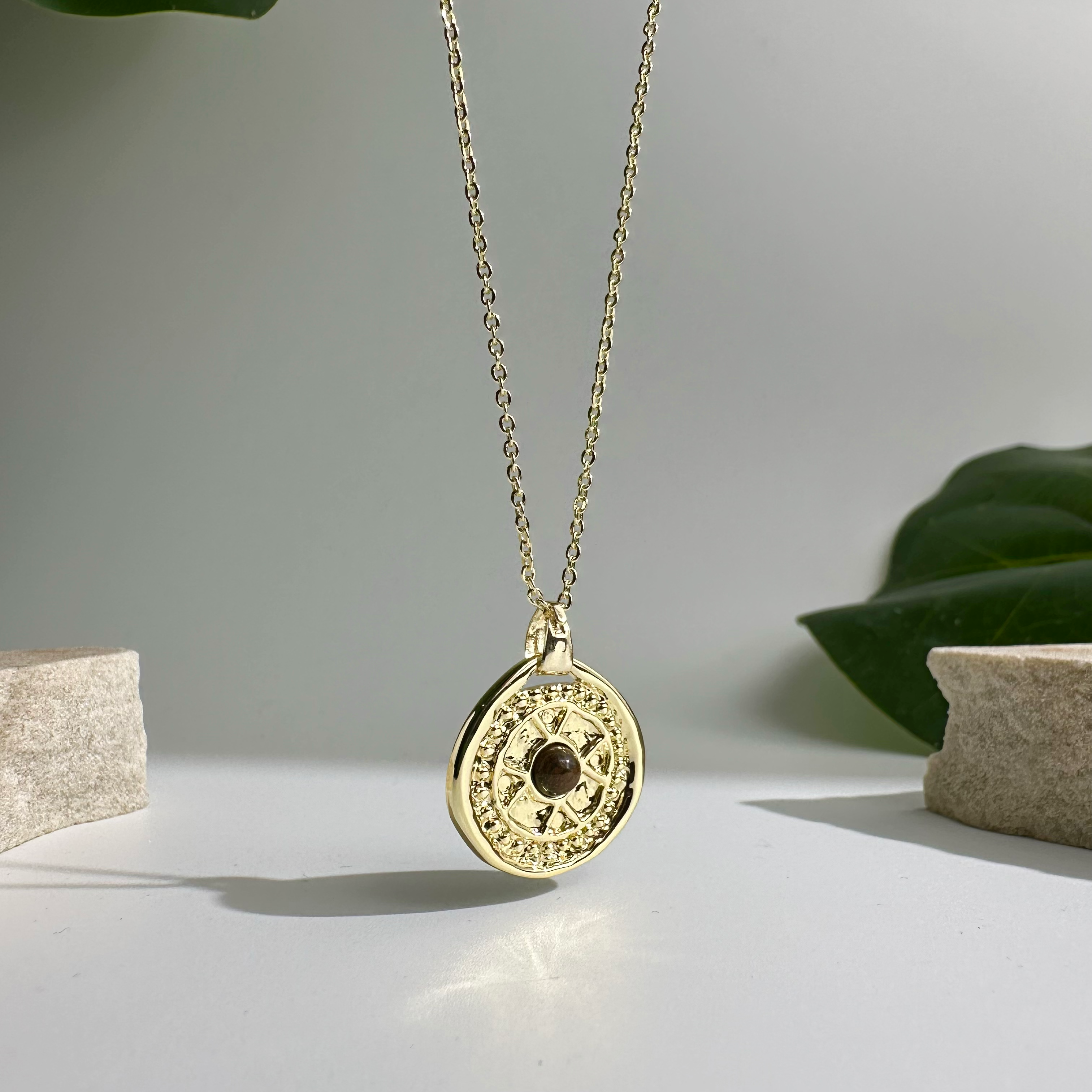 Featuring a finely detailed coin pendant, reminiscent of old-world currencies, this necklace exudes an aura of mystery and antiquity. The coin is framed by a delicate chain, making it the perfect statement of elegance and heritage.