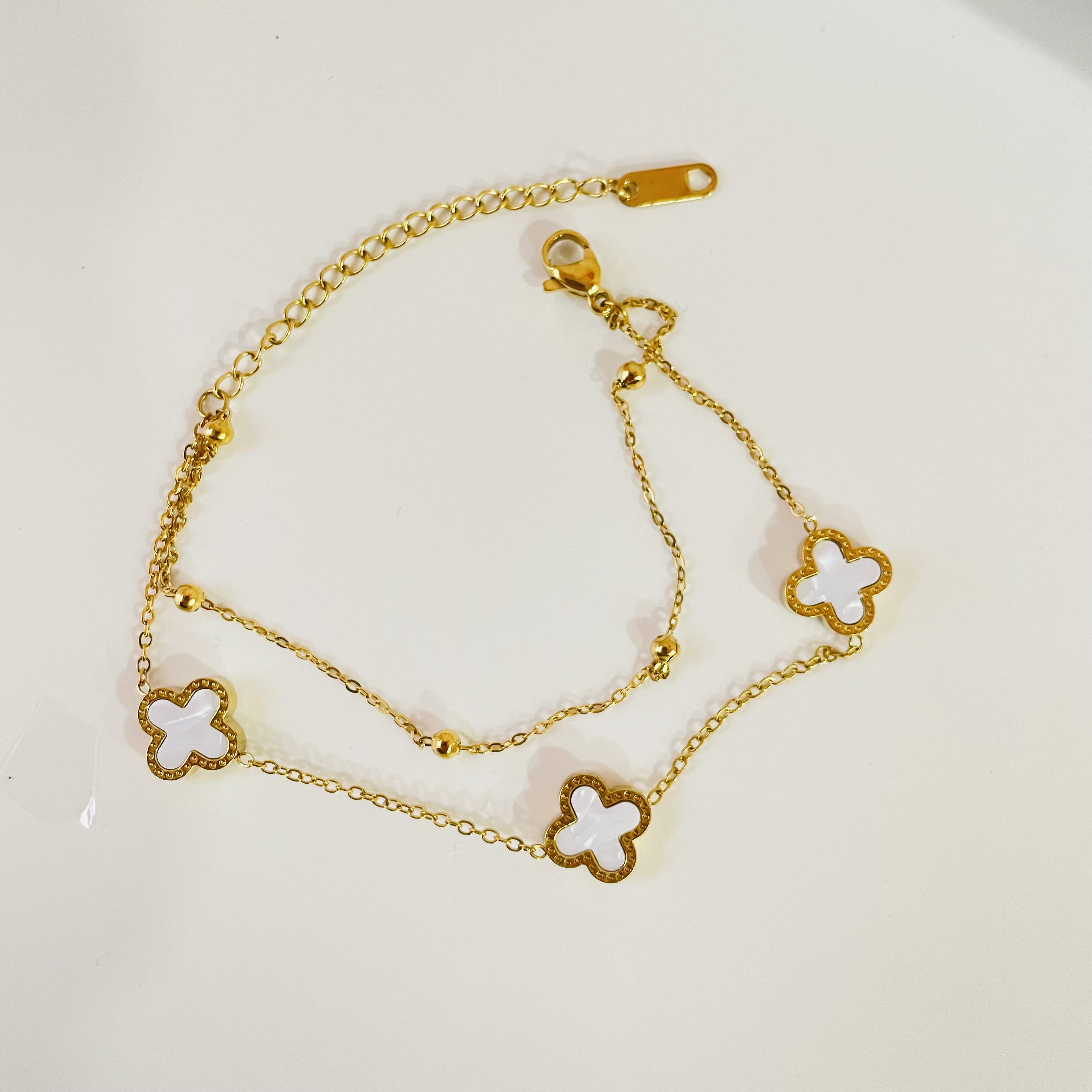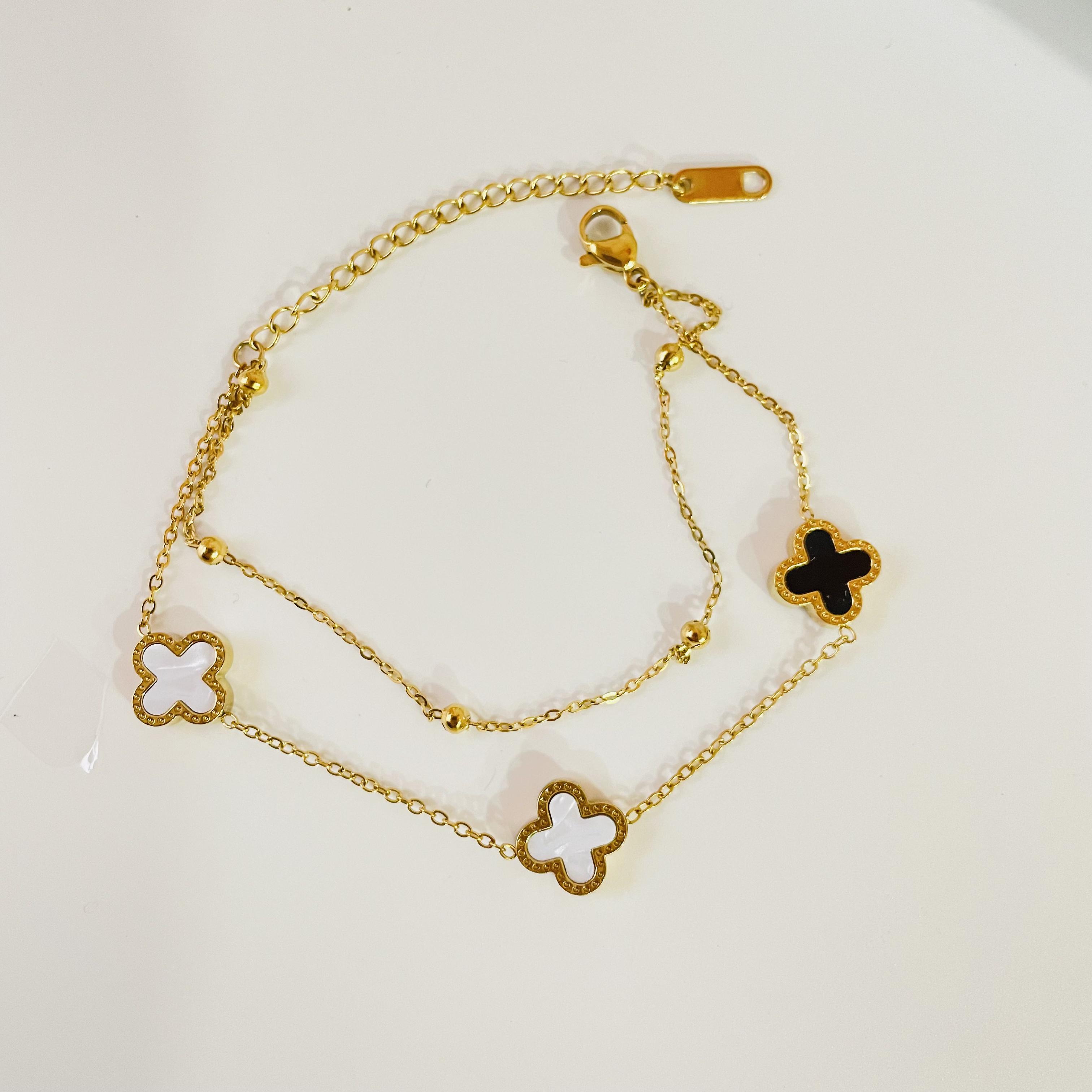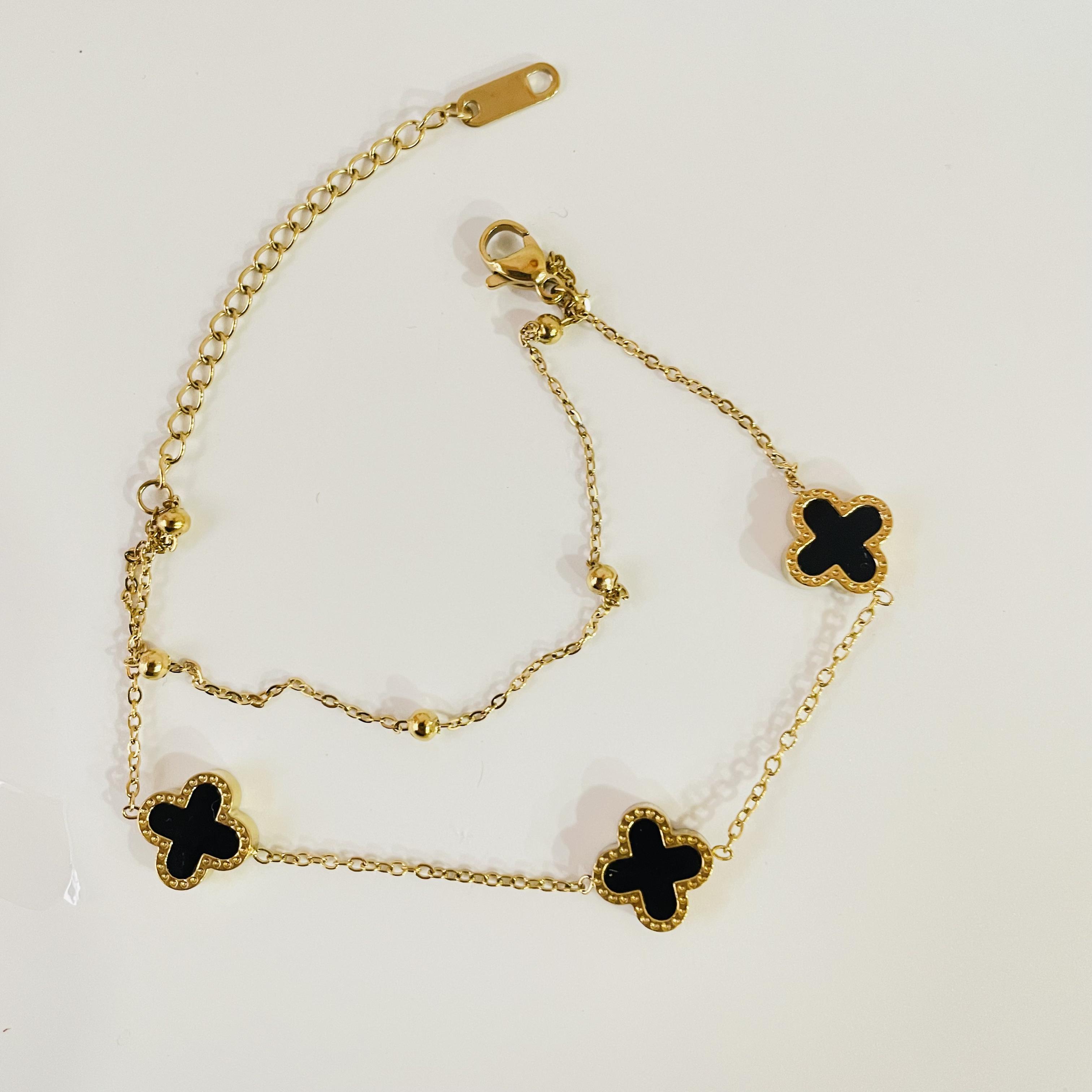 The Black Clover Duo bracelet showcases two sleek black clover charms set against a polished silver or gold chain. The contrasting dark clovers symbolize mystery and elegance, while the metal accents add a refined touch.