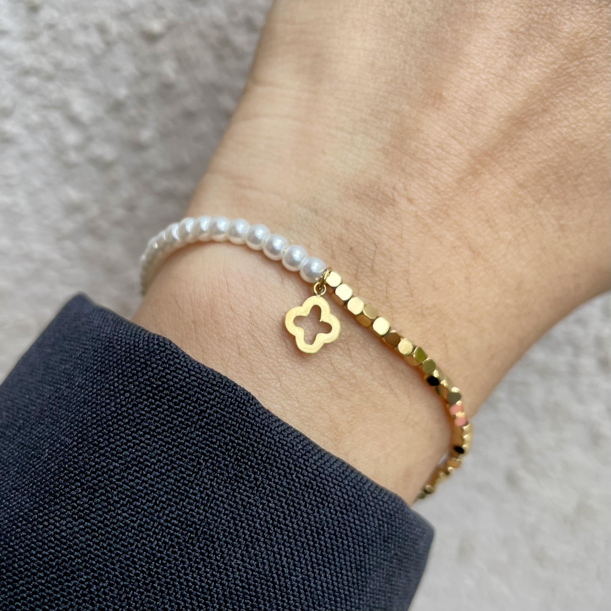 The Clover Pearl Charm bracelet features a delicate string of lustrous pearls, beautifully complemented by a charming clover pendant. This elegant piece not only exudes sophistication but also symbolizes good luck and positivity.