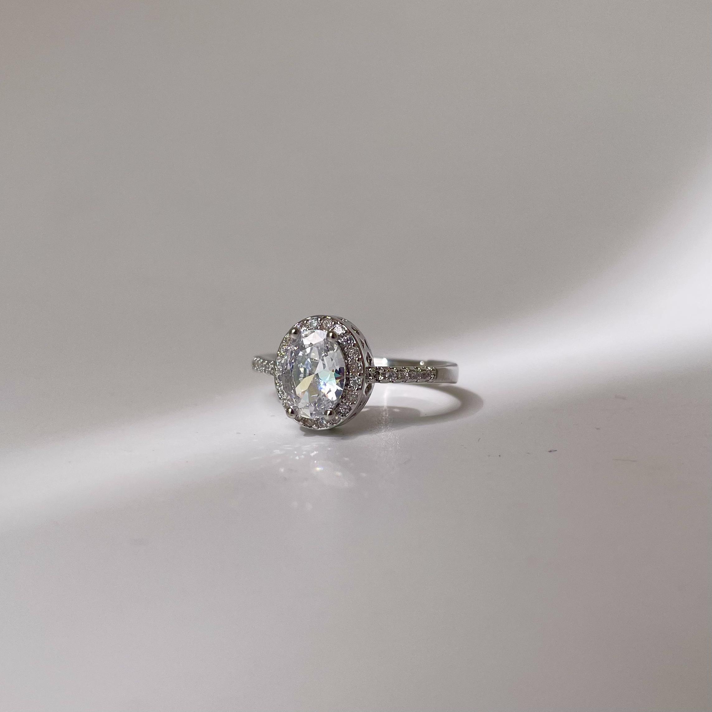 A Silver Diamond Oval Ring features an elegant oval-shaped diamond set in a sterling silver band. The oval diamond, known for its elongated and flattering shape, offers a sophisticated and timeless look. The sterling silver band adds a modern, sleek finish, creating a beautiful contrast with the sparkle of the diamond.