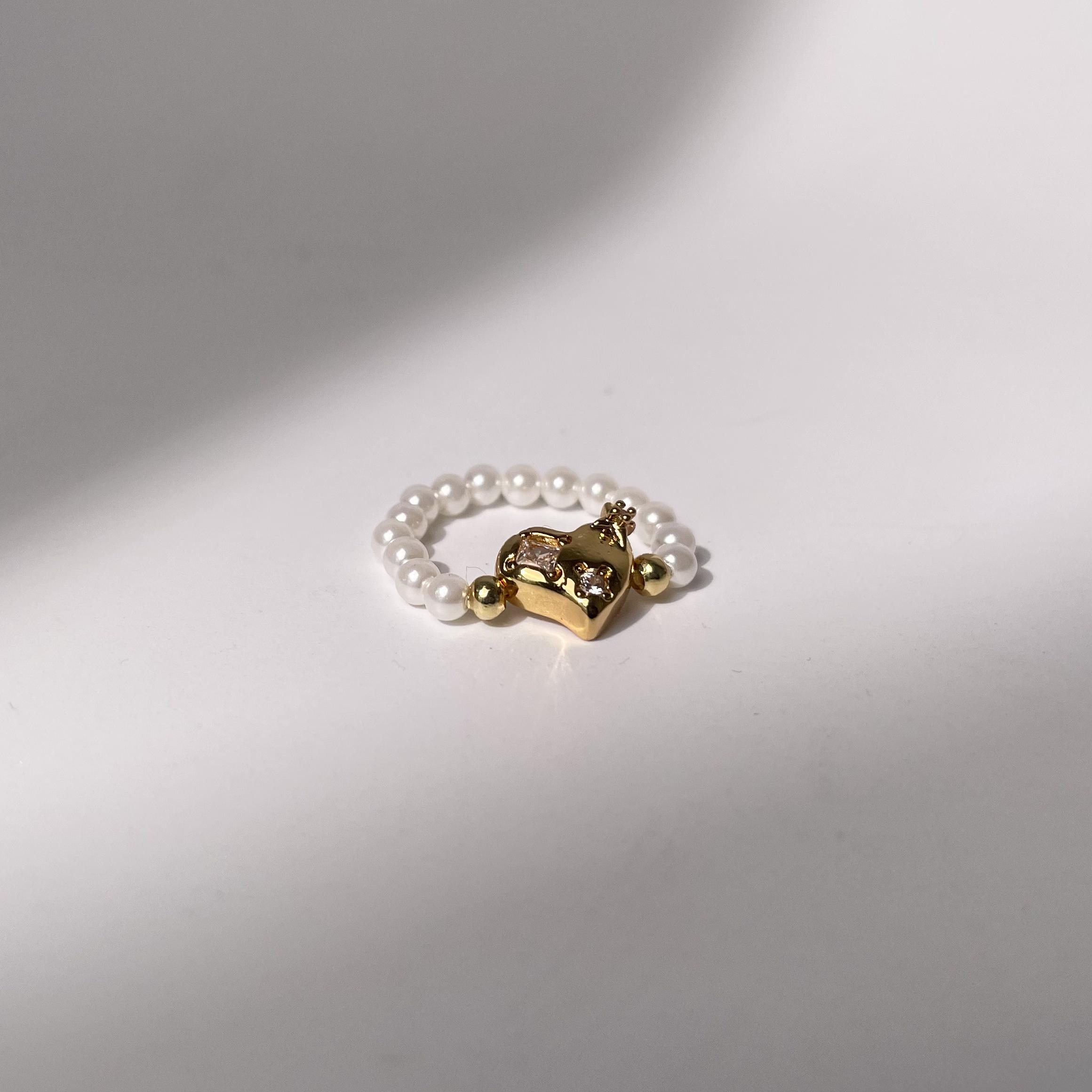 The Gold Heart and Pearl Ring is a captivating blend of elegance and romantic charm. The design features a beautiful heart-shaped motif crafted from high-quality gold, symbolizing love and devotion. Set within or alongside the heart is a lustrous pearl, known for its timeless beauty and delicate glow. The combination of the warm, rich gold and the soft iridescence of the pearl creates a sophisticated yet sentimental piece of jewelry.