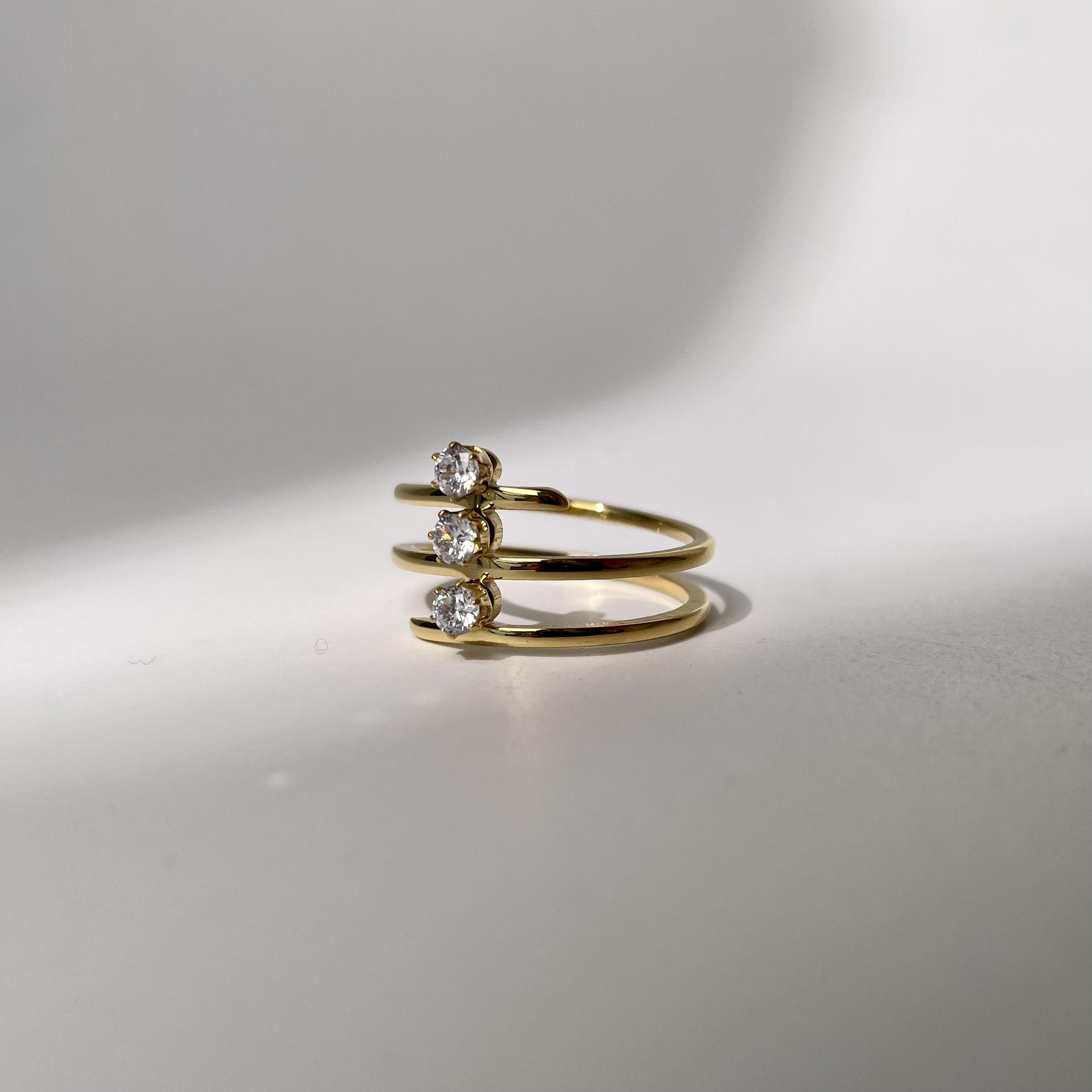 The Golden Cascade Ring showcases a striking triple-band design in polished gold, seamlessly intertwined for a modern yet elegant look. Each band is crowned with a sparkling solitaire diamond, creating a cascading effect of brilliance. The minimal yet impactful style makes this ring a versatile statement piece, perfect for adding a touch of luxury to any outfit.