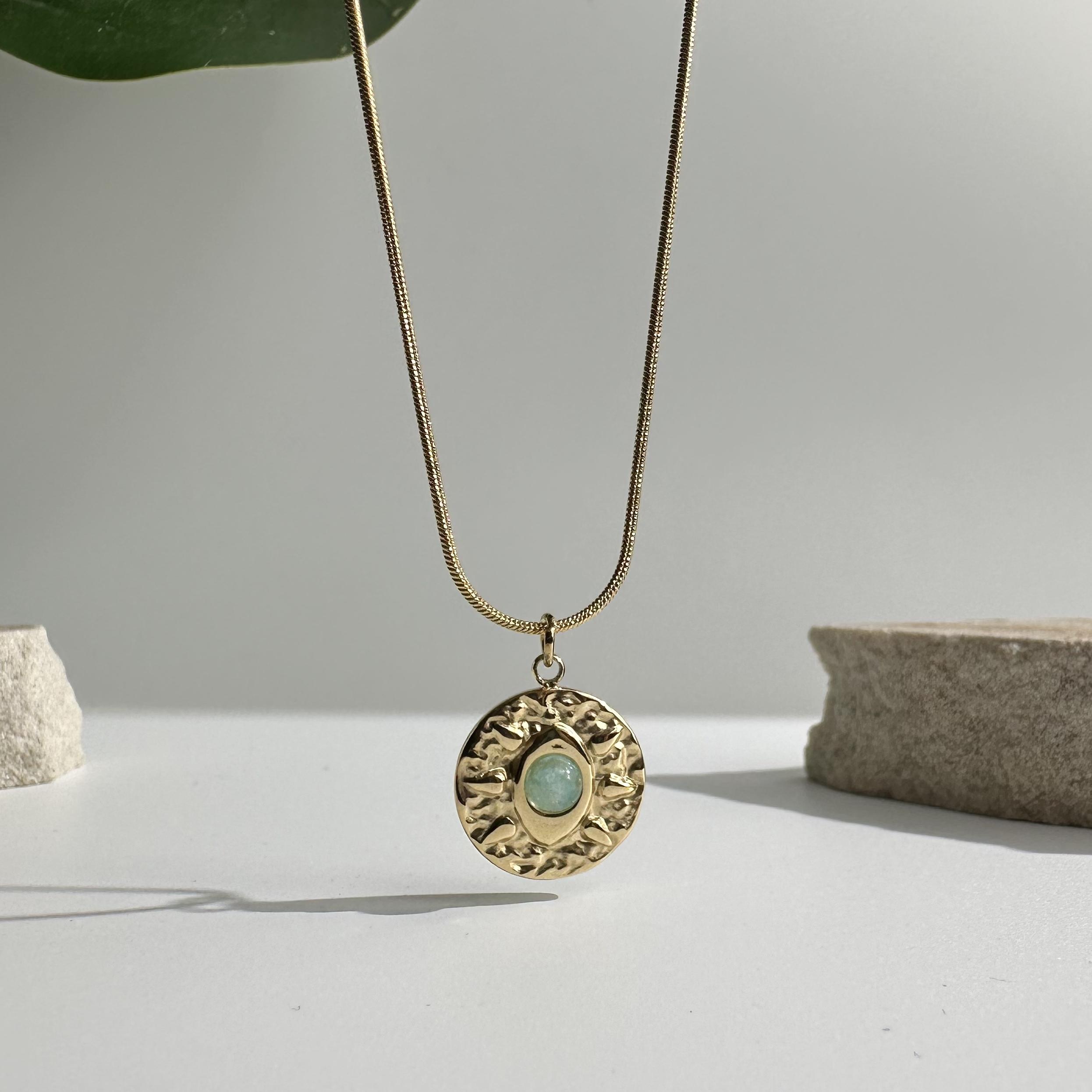 The Green Stone Pendant necklace features a round green stone elegantly set in gold. The vibrant green color is beautifully complemented by the warm gold setting, creating a chic and timeless piece. Suspended from a delicate chain, this necklace is perfect for adding a touch of color to any outfit.