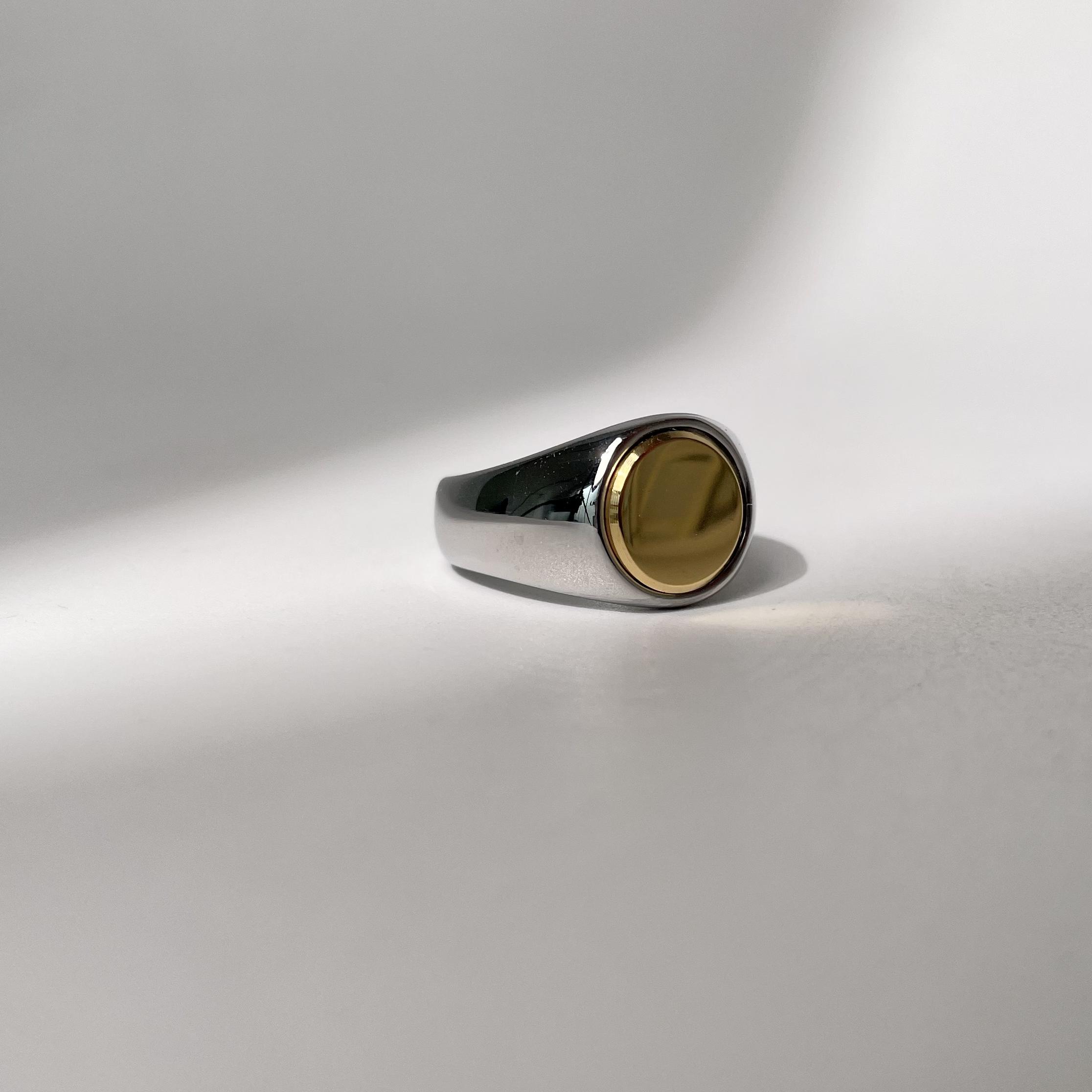 A seamless blend of opulence and modernity, this captivating ring features a striking round gold band artfully complemented by sleek silver accents. The dual-metal design symbolizes unity and contrast, creating a versatile piece that radiates timeless elegance. Perfect for those who cherish bold statements and effortless sophistication