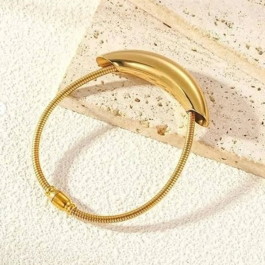 The Kinetic Curve Kada is a captivating piece of jewelry that embodies modern minimalism. Its sleek, gold-toned design features a fluid, curving form that gracefully encircles the wrist. The unique shape creates a sense of movement and dynamism, as if the bangle were in constant motion.