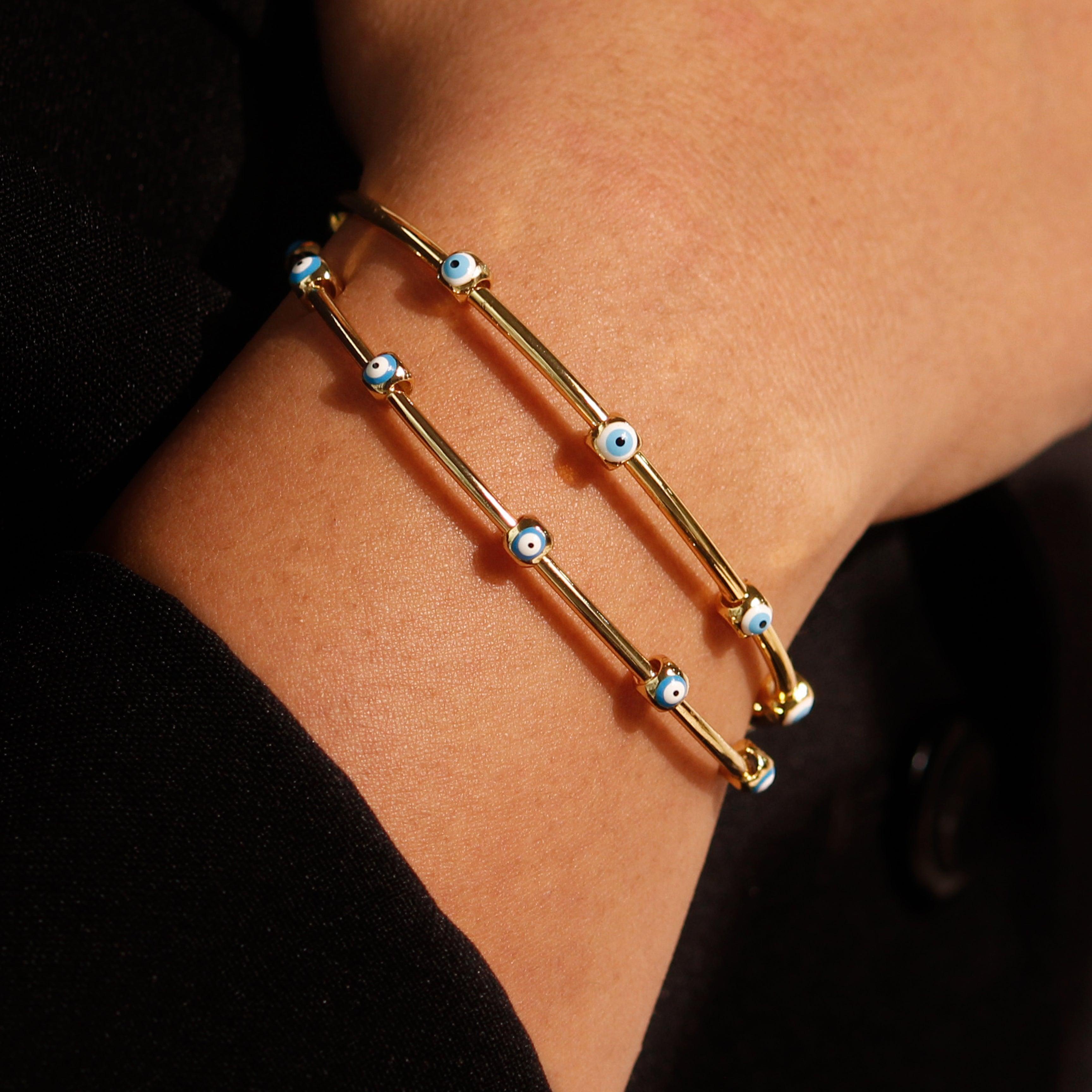 The Luna Eye Kada features a calming palette of blue and white, highlighted by the protective evil eye symbols. The combination of these colors creates a serene and elegant design, making it a versatile accessory for those who value both beauty and spiritual significance. Ideal for everyday wear or special occasions.