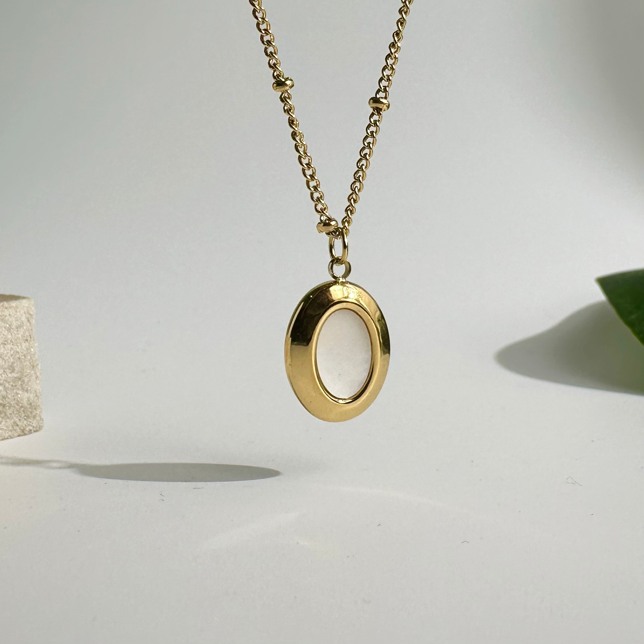The centerpiece of this elegant piece is a radiant nacre (mother-of-pearl) pendant, known for its soft iridescence and calming hues. Set in a smooth, polished metal bezel, the natural luster of the nacre catches the light, offering a subtle yet captivating glow.