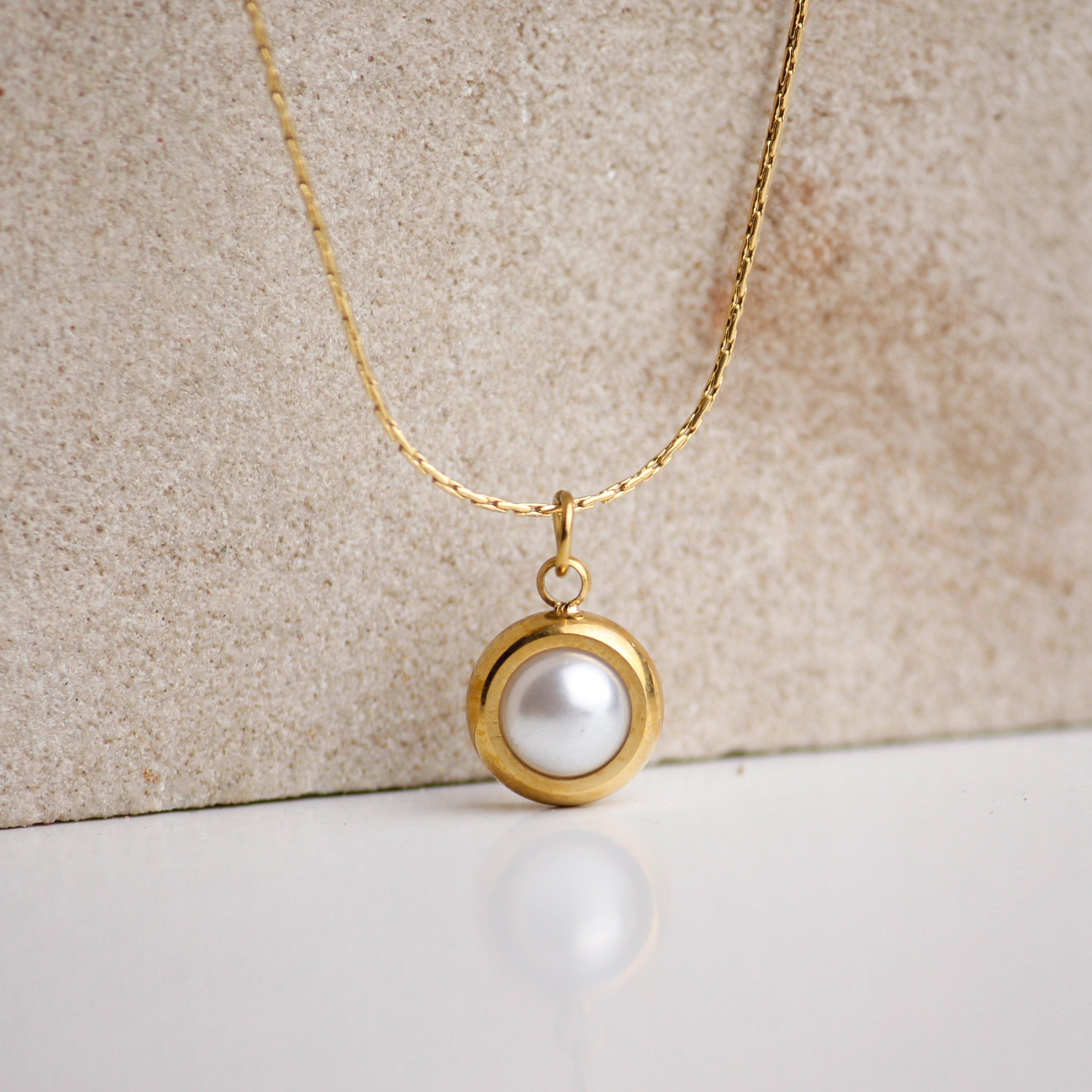 Orb Necklace features a pristine round pearl encircled by a sleek gold cover, offering a harmonious blend of classic and contemporary styles. The gold’s gleam highlights the pearl’s iridescent glow, making this necklace a perfect choice for adding a subtle, elegant touch to both casual and formal outfits.