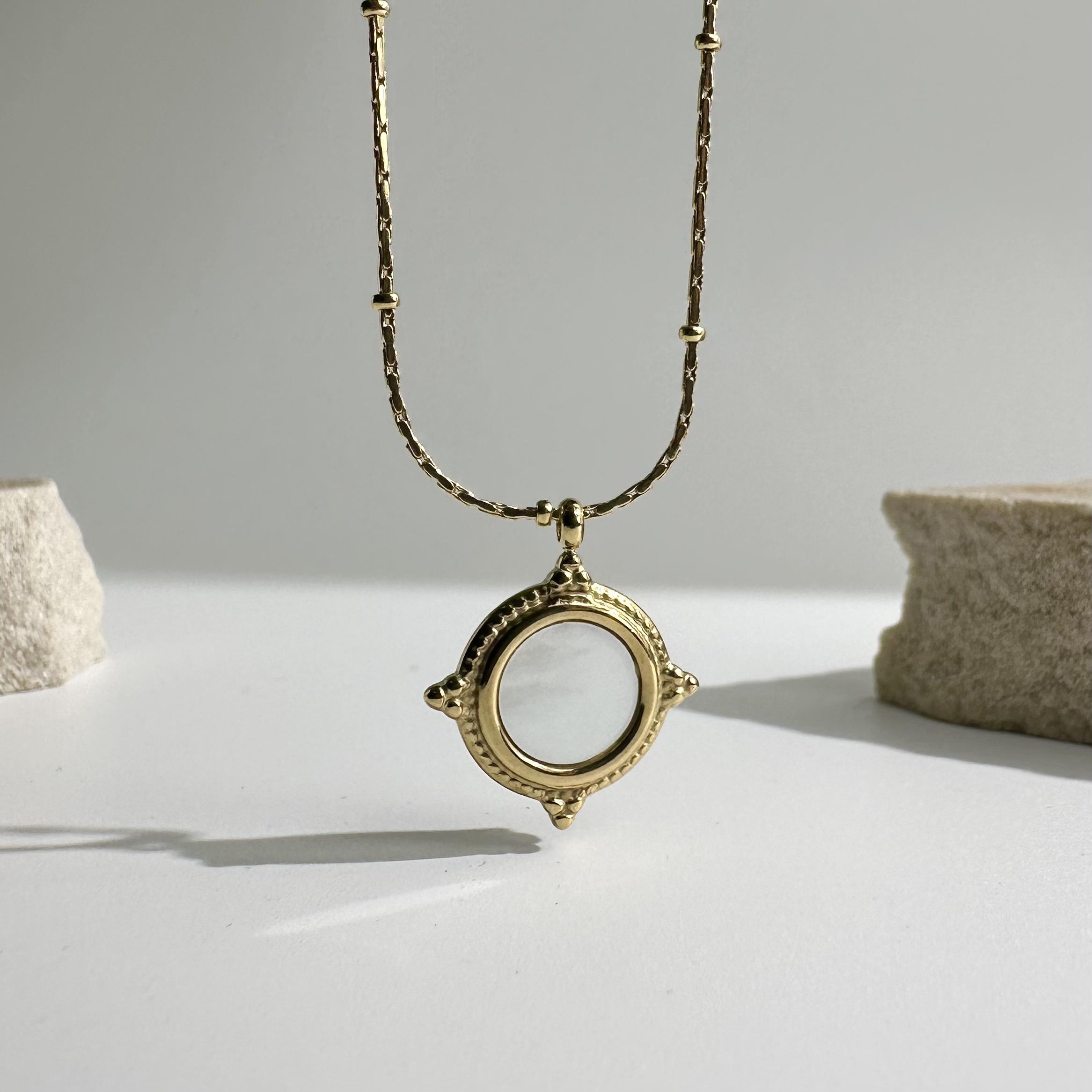 he Pearl Circle necklace features a sleek, round mother of pearl pendant that shimmers with soft, iridescent hues. Its simple, elegant design makes it a versatile piece, perfect for adding a touch of natural beauty to any outfit. Suspended from a delicate chain, this necklace captures the timeless elegance of mother of pearl in a refined, modern style.