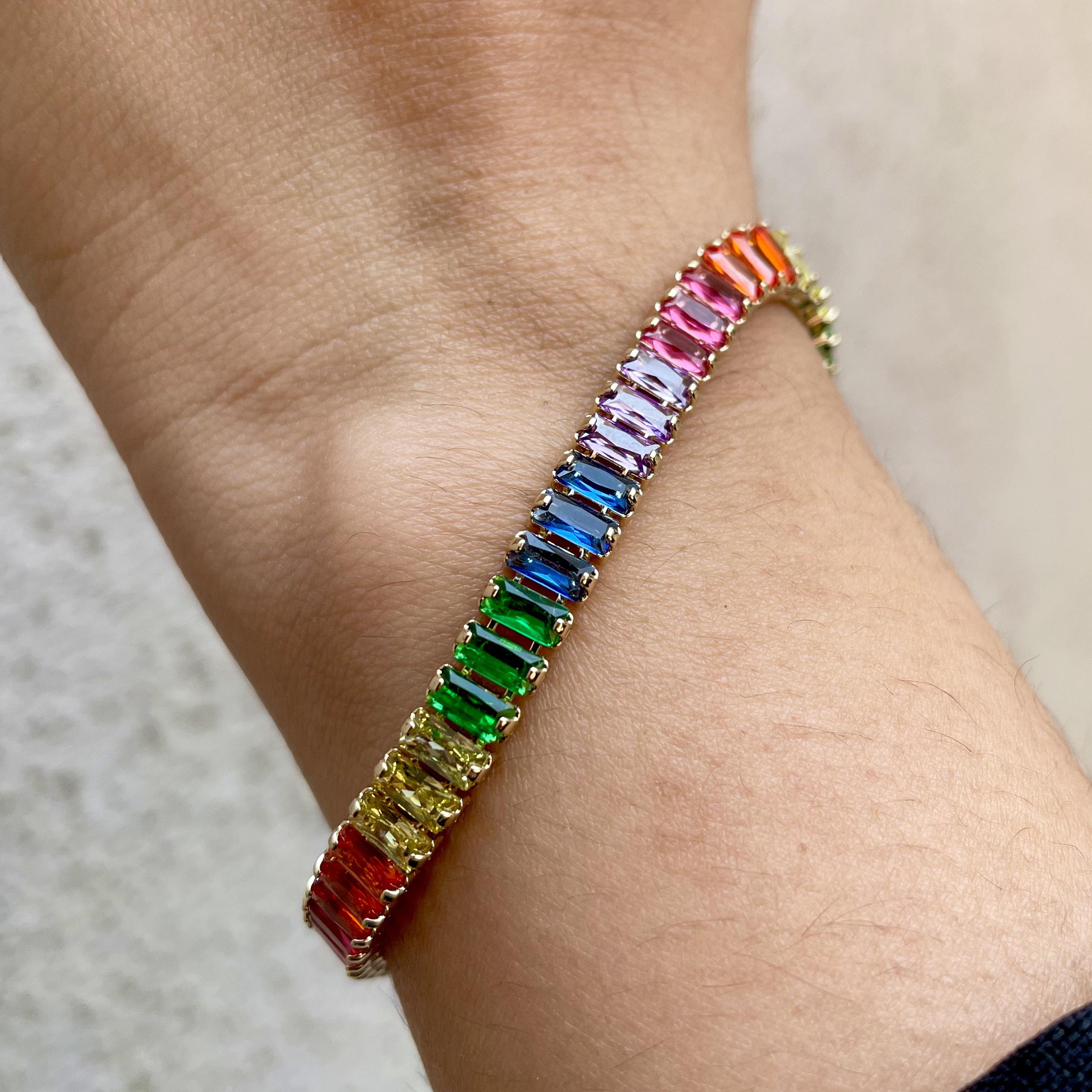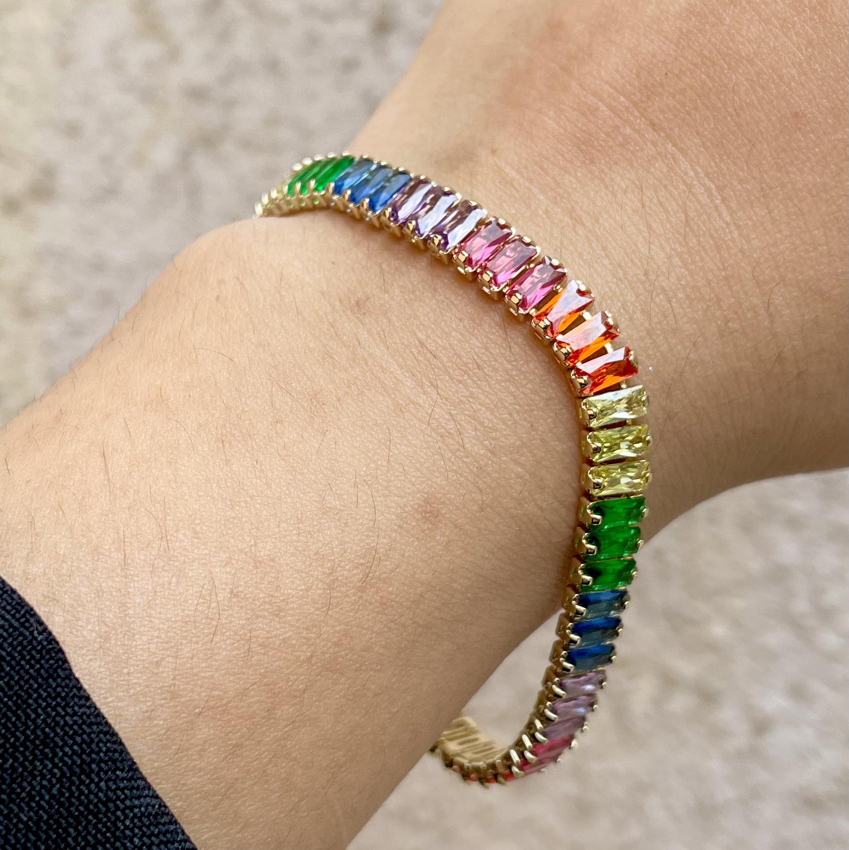 Embrace the vibrant energy of the Rainbow Baguette Bracelet. This dazzling piece features a captivating row of baguette-cut gemstones in a rainbow of colors, creating a truly mesmerizing effect.