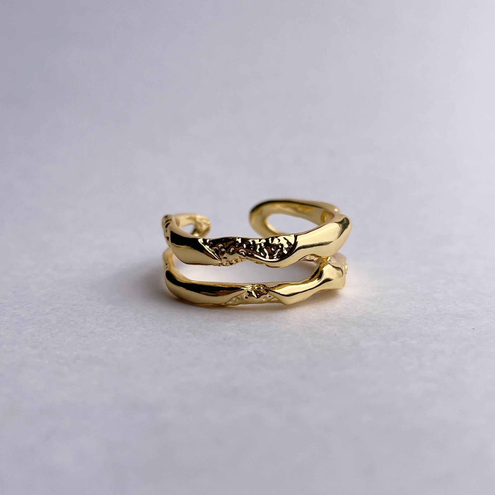Defy convention with the Rebel Ring. This striking piece, forged in gleaming gold, embodies a spirit of individuality and unapologetic self-expression. Its jagged edges and textured surface, reminiscent of untamed landscapes and rebellious hearts, challenge the ordinary. The dynamic double band design adds a sense of depth and defiance, daring to be different. More than just an accessory, the Rebel Ring is a symbol of bold individuality, a reminder to break the mold and embrace your inner rebel.