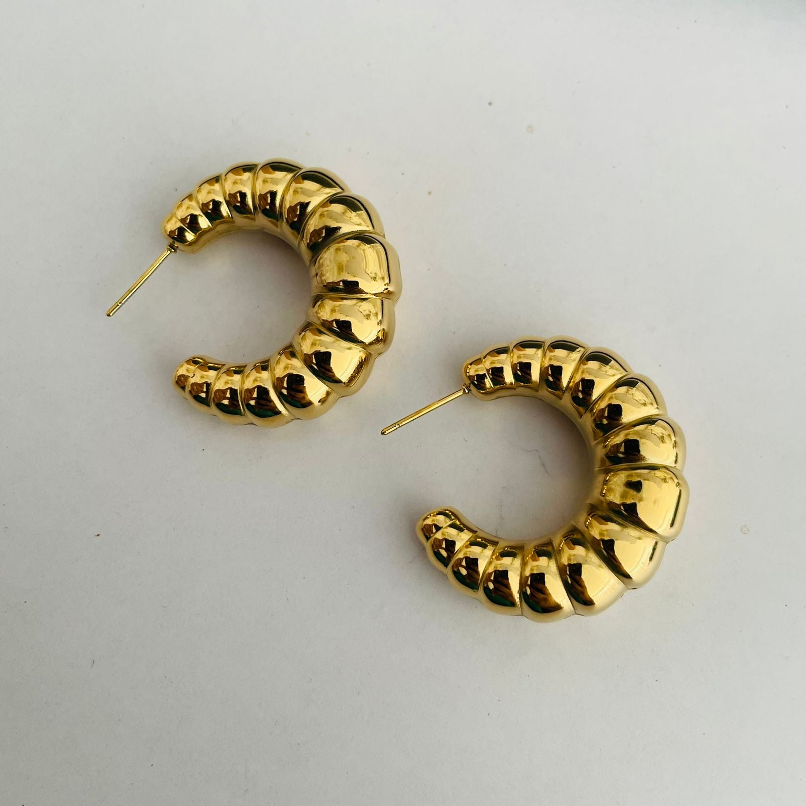 Crafted from lustrous gold, these hoops feature a ribbed design that adds depth and dimension to the classic hoop shape. The ridged detailing catches the light beautifully, creating a subtle shimmer with every movement. Their bold yet refined look makes them versatile enough for both casual outings and formal occasions.