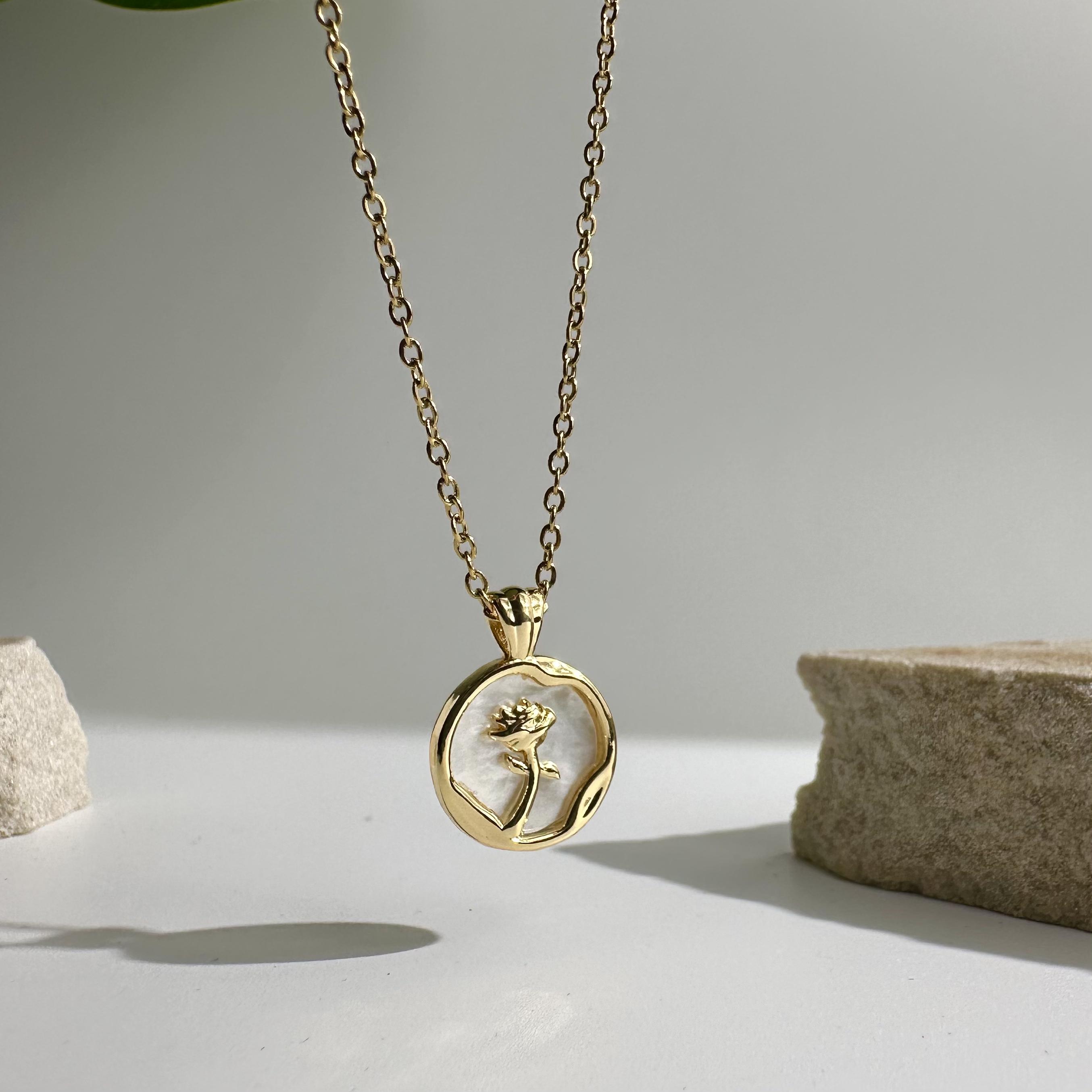 The Rose Pearl necklace features a beautifully detailed rose-shaped pendant carved from mother of pearl. The natural iridescence of the pearl adds a soft, elegant glow to the intricate design, symbolizing beauty and grace. Suspended from a delicate chain, this necklace is a timeless piece that blends floral charm with the lustrous allure of mother of pearl.