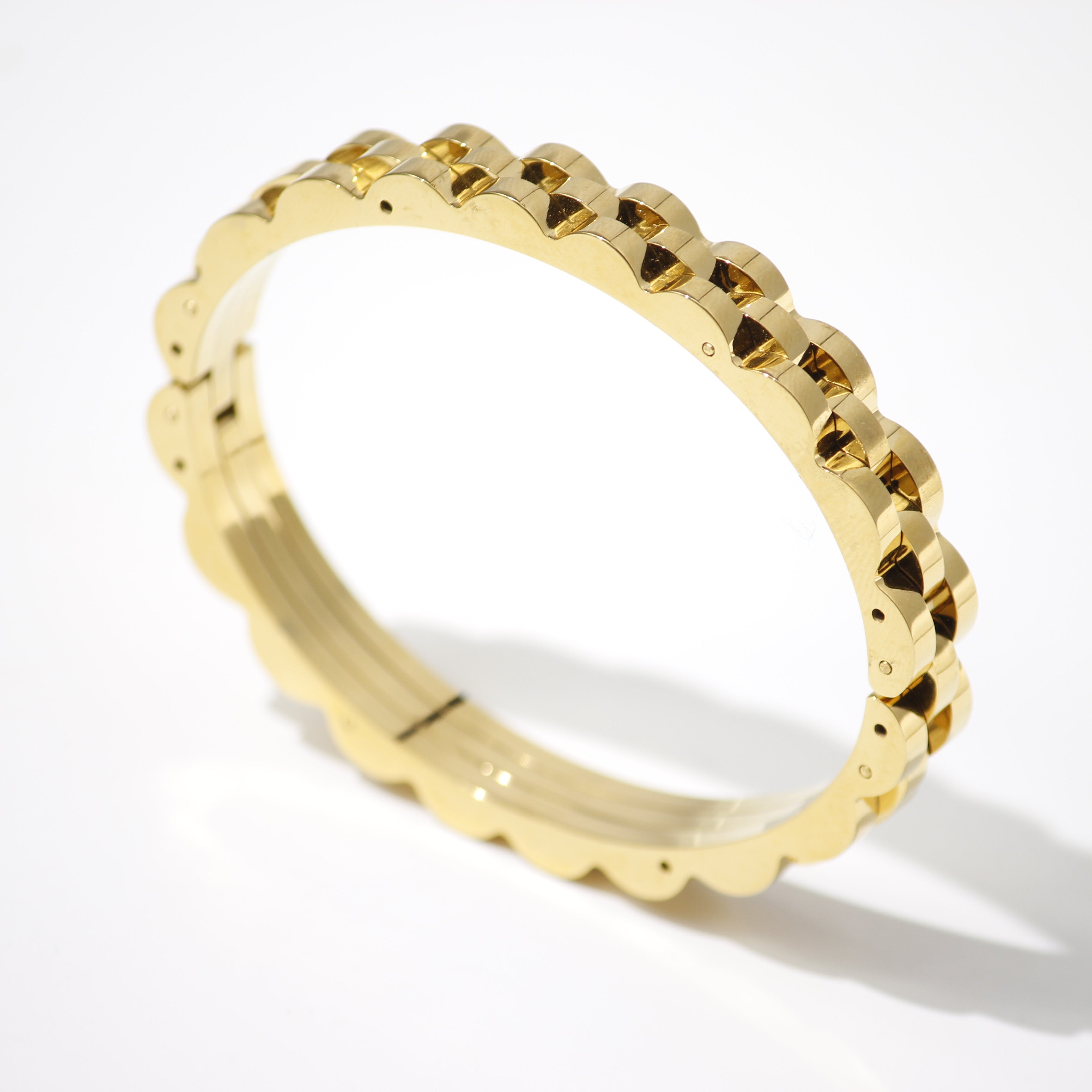 The Scalloped Gold Cuff Bangle is a captivating piece of jewelry that exudes understated elegance. Its sleek gold-toned design features a series of delicate scallops along its surface, creating a mesmerizing interplay of light and shadow. The textured finish adds a touch of dimension and visual interest, making this a truly unique and eye-catching accessory.