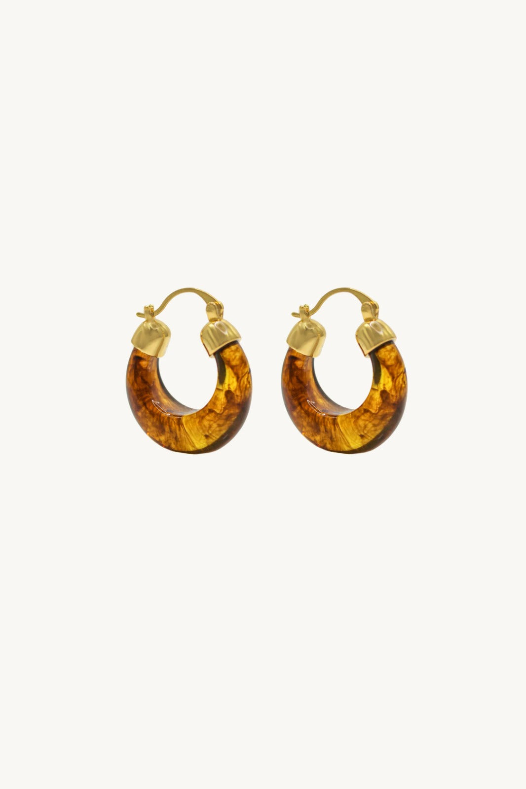 A bold blend of retro charm and modern elegance, the Syran Loop hoop earrings feature a rich amber-toned resin arc embraced by gleaming gold accents. Their sculptural silhouette and glossy finish evoke warmth and sophistication, making them a striking statement piece for day or night. Lightweight yet impactful, these hoops are where golden hour meets timeless style.