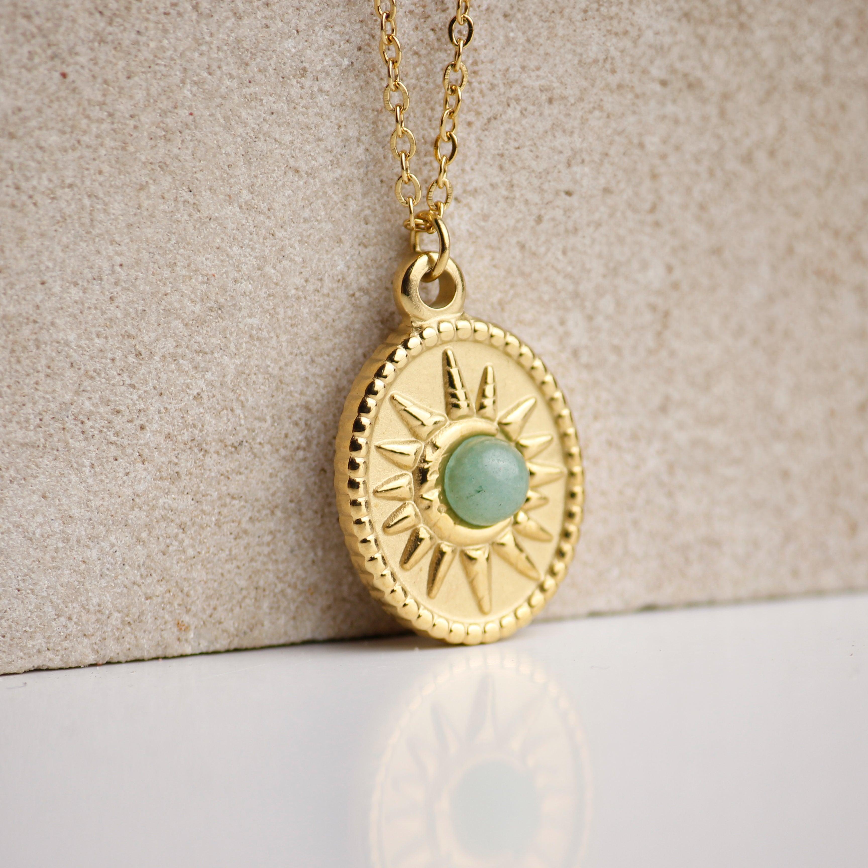 The Verdant Sun Necklace features a dazzling green stone set in a sun-inspired design. Its vibrant hue evokes the refreshing glow of a sunlit meadow, while the elegant setting enhances the stone’s natural brilliance.